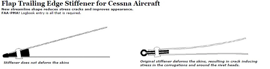 Improved Fit to Reduce Skin Stress The stiffeners are accurately shaped to the same angle that the top and bottom skins come together to completely eliminate the bending stress due to riveting the skins together. This prevents stress concentrations in the skin corrugations and near the rivets, making cracks less likely. Streamline Shape The design smoothly transitions from the skin surface to a blunt trailing edge. It maintains the flap's natural airfoil shape by eliminating the unsightly bulb and resultant drag found on common trailing edge stiffeners. What is the purpose of a flap trailing edge stiffener?