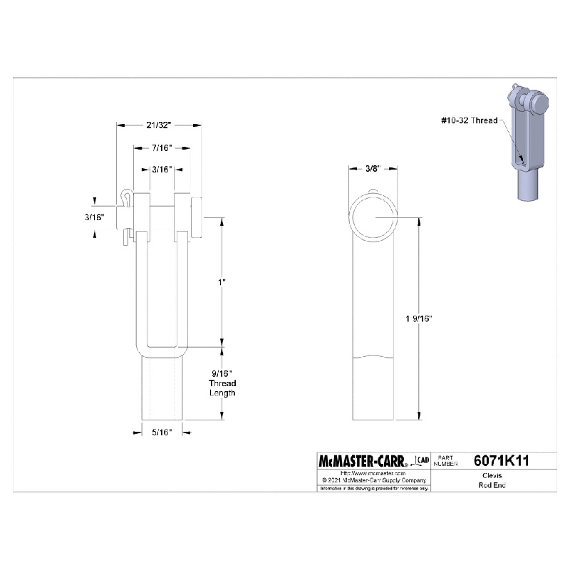 Clevis Rod End, 10-32 Thread, 1-9/16 Shank