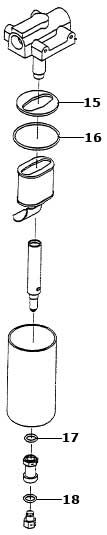 Cleaning the Fuel Screen - The fuel screen is removed by removing the standpipe. The rubber tipped plunger must be unseated before the standpipe is loosened. Failure to lift the plunger off of its standpipe seat can damage the plunger. Pull the strainer drain knob as if you were draining the fuel bowl. Block or clamp the knob in this position. Insert a smooth round tool such as a screwdriver or punch in the standpipe cross-hole and unscrew the standpipe. |