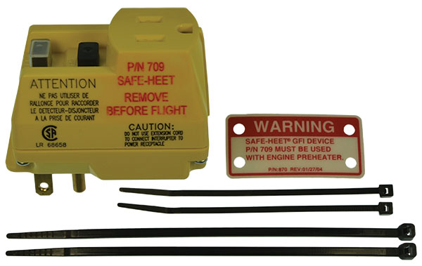 The 709SK GFCI Service Kit is a safety upgrade for the SAFE-HEET line of engine heaters or any other silicone pad engine heater. The kit provides ground fault and surge protection and all appropriate placarding and instructions for compliance with McFarlane Service Bulletin SB-3. The addition of one 709 Ground Fault Circuit Interrupter and surge protector in every SAFE-HEET now makes our engine heater the safest unit available. With ground fault and surge protection the chance of dangerous and undetected lightning and mechanical damage that could cause lethal electrical shocks or engine damage is eliminated. SAFE-HEET uses U.L. recognized components and a 100% thermal fused element. The element itself shuts down the flow of electricity if any point on the element overheats. SAFE-HEET is thermostat controlled to maintain oil sump temperature less than 160 deg F. There is no flame or hot air to burn paint or plastic parts. The risk of fire associated with cold starts is reduced. Features and Benefits: