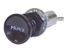 | Plunger Primer Mounts in panel thru 3/4' hole. Comes complete with nut and Lockwasher as shown. Two rear ports accept any 1/8' id. fuel line. Attach supply line to angled port. Straight port routes to Carburetor. |