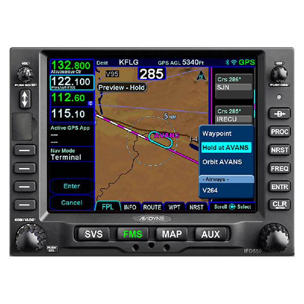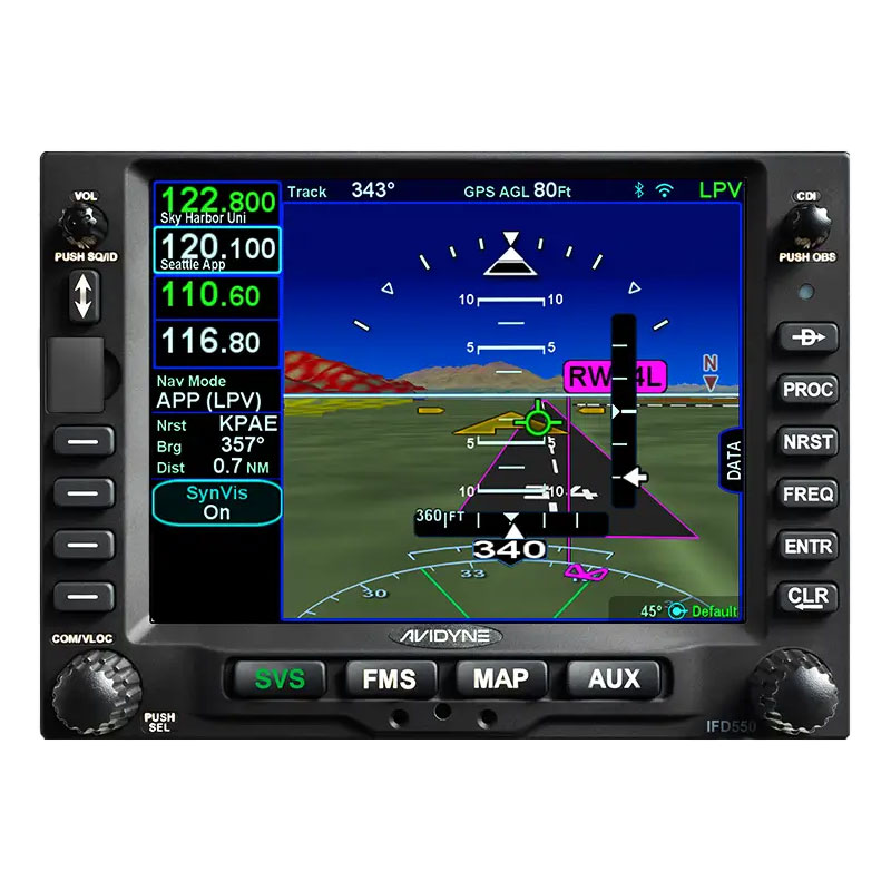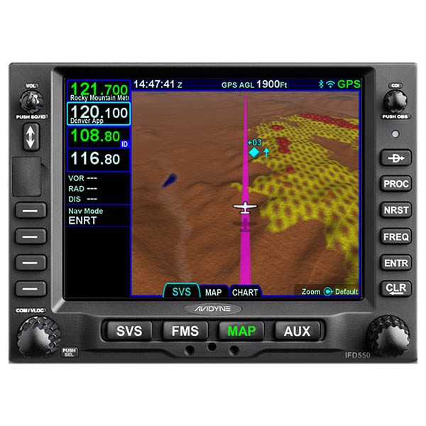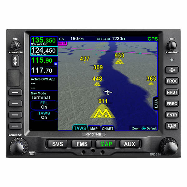 | The IFD550 is Avidyne’s Premium panel-mounted FMS solution. The IFD550 has all the features and power of the IFD540 with the added benefit of 3-dimensional “ego-centric/ out-the window” Synthetic Vision views. Thanks to its integrated Attitude Reference System (ARS) and Dynamic SVS, you can “see” all your flight information laid out in front of you, giving you unprecedented situational awareness. Synthetic Vision shows terrain in 3D with hazard alerting, obstacles, and traffic. Everything you need to see on a bright, easy-to-view 5.7” touchscreen. As with all of Avidyne's IFDs, the IFD550 includes many great features that make operation much easier including FMS Preview, which lets you easily create, upload and review your flight plans visually with changes shown on the screen before selection. And with Avidyne's patented GeoFill™, in-flight changes are a snap because the IFD550 predicts your next entry based on your location, not the sequence in the database. |