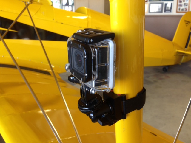 This configuration comprises a small front clamp with a laser cut rubber bund attached to a 7.00″ strap. Due to the smaller chord length strut it is not feasible to use a separate rear clamp. Instead, a laser cut rubber piece (ie bund) is attached to the strap. The rubber bund is positioned on the strap so that when the strap is tightened it falls mid way on the trialing edge and adds a non marring gripping force. Clamp parts are 6061-T6 CNC machined from custom extrusions designed specifically for this application. All CNC machined parts are then anodized black. All additional assembly hardware is 1018 Stainless Steel. Camera interface is a professional ball mount with a 1/4-20 threaded stud. The professional ball mount allows the ability to set the shot in an any orientation desired then lock it in place. Ie Forward, Aft, toward pilot, straight down etc. The front clamp contacts the leading edge at opposing tangent points with a set of rubber feet. Included are two different sets of rubber feet in a soft and hard compound.