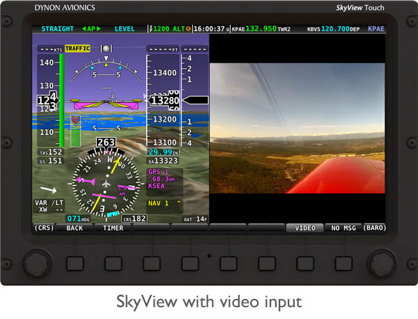 With SkyView 11 Software, all SkyView Touch and new SkyView screens can display video in both full-screen and split-screen formats when equipped with a Video Input Adapter. Video sources connect via s-video or composite input. Both NTSC and PAL formats are supported for worldwide compatibility.