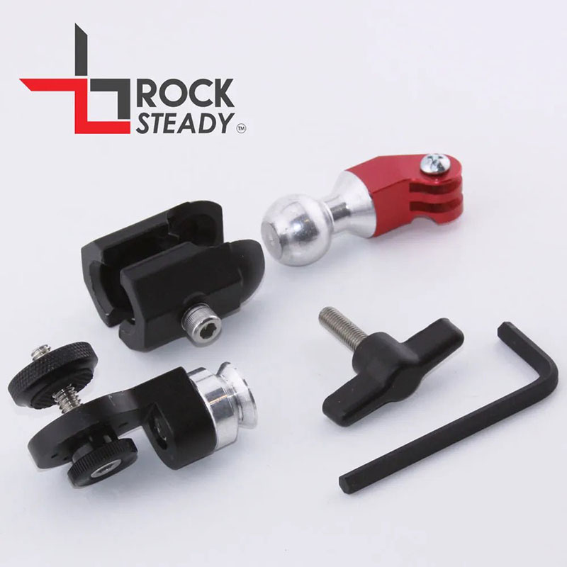 | GoPro Ball Mount The Rock Steady GoPro style ball mount is the durable and versatile low-profile design that you have been looking for. Unlike plastic mounts, this quality all-metal mount will not move, bend, or fail. The metal GoPro adapter is compatible with any GoPro-style camera. This unique GoPro adapter allows more motion than any other GoPro adapter. The knuckle clamp attaches to any Rock Steady base. The ball and socket adjust a full 360 degrees and then lock your camera into position with a clean hex drive screw or by hand with an included T-handle screw. Buy multiple Rock Steady bases to add numerous quick-change mounting locations at an affordable price. Compatible with all GoPro cameras, Garmin Virb XE, Ultra 30, Virb 360, or any GoPro-style camera. Rock Steady Tie Down Ring Base With the Rock Steady Tie Down Ring Base, quickly turn any standard tie-down ring into a camera mount. This clamp can be easily tightened by hand, making it an FAA-compliant temporary mounting device. The thumb screw hex drive head allows you to tighten it with the included hex wrench too. The aluminum taper nut allows quick attachment to any tie-down ring. This tie down ring base is compatible with all Rock Steady mounts. Note: Device Holders Sold Separately. |