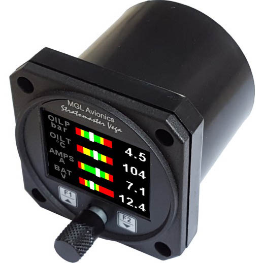 The TP-3 is a 2 1/4” sunlight readable 4 channel universal analog input color display instrument. Each channel can be individually programmed to display either pressure, temperature, current or volts from a universal analog input that can interface to many sensors such as oil temperature, coolant temperature, oil pressure, fuel pressure, manifold pressure, boost pressure and many more. The TP-3 can display any combination of 1 to 4 analog channels in a horizontal / vertical bargraph or a numeric display format. Pressure can be measured using standard automotive resistive senders (e.g. VDO 2, 5 and 10 Bar), Rotax 4-20mA senders as well as voltage output pressure senders (e.g. UMA). Temperature can be measured using standard automotive resistive senders (e.g. VDO, Westach) as well as the MGL Avionics precision LM335 semiconductor sensor. In addition the temperature, pressure and current inputs can be programmed to a user defined curve for custom senders. All analog channels have a programmable low and high alarm. This results in a contact closure that is typically used to switch a warning lamp on. The TP-3 also records the minimum and maximum values reached for each channel in permanent memory. The TP-3 can also be interfaced via the CAN bus to an external RDAC unit (Remote Data Acquisition Computer). This allows for easier installation as the RDAC unit is normally mounted in the engine compartment. |