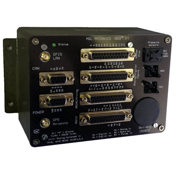 The iBox is the heart of the iEFIS system, and the conductor in the symphony of communication between all system devices and the iEFIS screens. The iBox contains the GPS engine (with antenna connection), the pitot/static sensors and Angle of Attack sensors. The iBox is the hub of communication for all the system devices (AHRS, RDAC, Autopilot Servos) and is also the hub of communication with all third party devices (radios, transponders, ADS-B, VP-X) via its RS-232 and ARINC interfaces.
