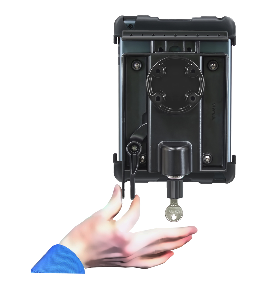 | The RAM-HOL-TABL11U consists of a spring loaded backplate, custom support cups and locking mechanism for the iPad mini WITHOUT skin, sleeve or case. This spring loaded design makes it easy to load and unload your iPad mini, along with keeping it secure while on the go. Cup ends are designed to optimize the functionality of your tablet, allowing access to audio jacks, usb, power, and other ports, your iPad mini can be used just as it was intended. Quickly lock the cradle, keeping your iPad mini secure and safe from theft. |
