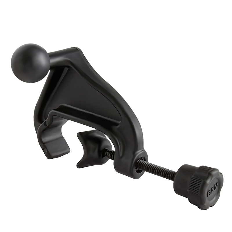 | The yoke clamp base will fit rails in diameter from 0.625 inch to a maximum of 1.25 inch. The 1 inch rubber ball is at a right angle to the plane of the mount; when connected to a rail, the ball sits parallel to the rail. |