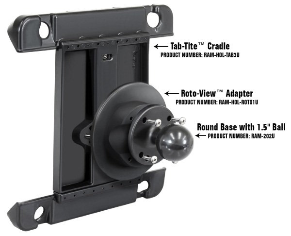 | The easy-to-use interface of your tablet makes for a user friendly experience, while on the go. Now you can optimize this mobile experience with the Roto-View™; an adapter plate that allows for adjustment to accommodate many tablet viewing configurations. The Roto-View™ utilizes multiple detents to adjust the tablet to the most popular viewing angles, including landscape and portrait mode. No need to loosen the knob of your double socket arm to reposition your tablet. Instead, simply rotate the cradle to achieve the same result. Compatible with a wide range of tablet cradles and mounts, RAM now offers yet another "easy-to-use" product to help enhance your mobile experience. |