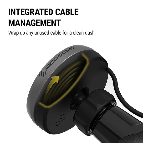 • Integrated Cable Management system coils and conceals excess cable behind the charging head for a clean dash.