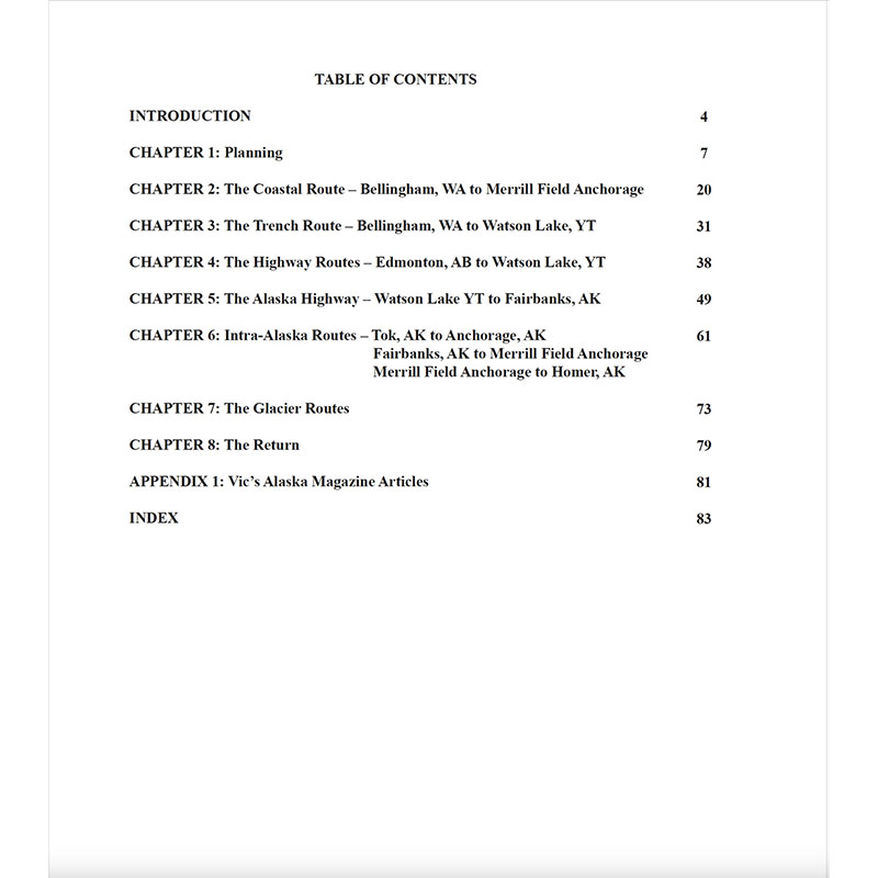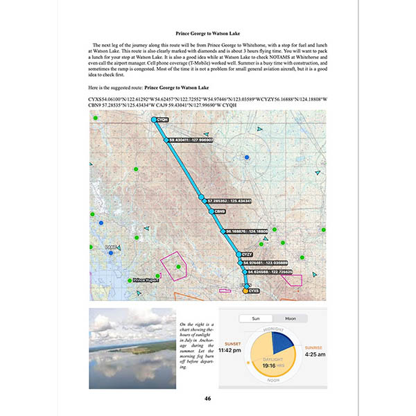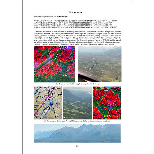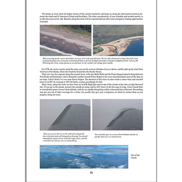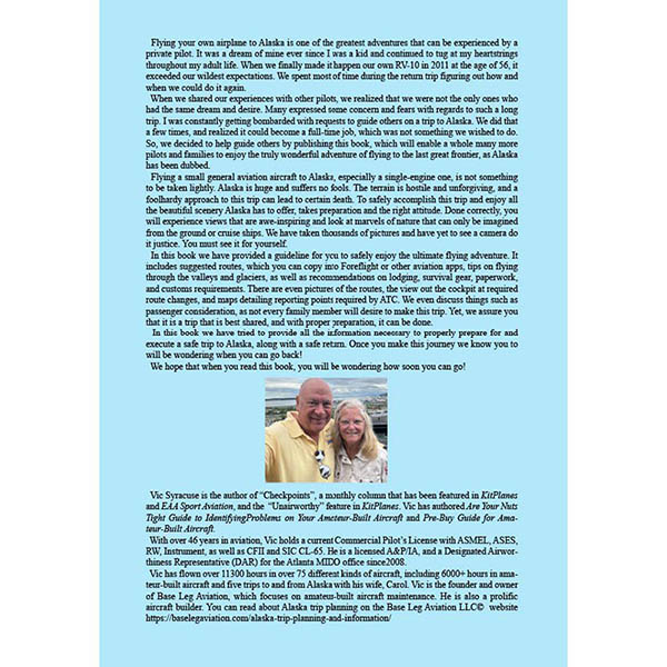 | We Flew to Alaska…and You Can too! A Private Pilot’s Guide to Flying to Alaska by well-known aviation author Vic Syracuse and his wife, Carol. It includes a wealth of information gathered from 5 flights to alaska in an RV-10. Detailed routes along with flight planning, and links to customs and border crossing requirements. There are photos comparing EFIS/GPS displays to cockpit views, along with primary and alternate routes. The hardcopy book includes a free digital download so routes can be copied and pasted into ForeFlight. This book is 84 pages with lots of photos and charts. It includes routes in Alaska to see glaciers and icepacks. The book also shares suggestions for lodging, booking hotels, and parking at airports. |