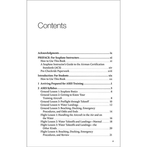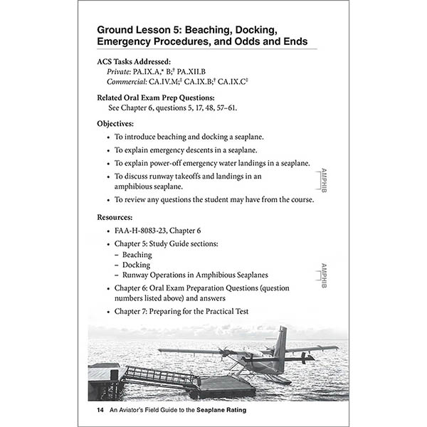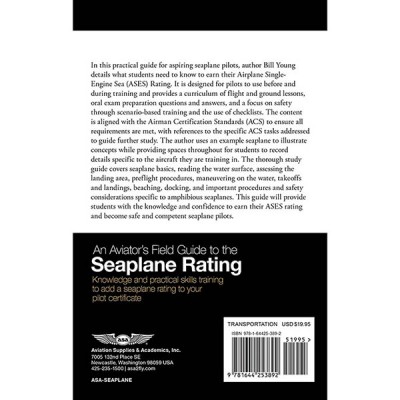 | Knowledge and practical skills training to add a seaplane rating to your pilot certificate. In this practical guide for aspiring seaplane pilots, author Bill Young details what students need to know to earn their Airplane Single-Engine Sea (ASES) Rating. It is designed for pilots to use before and during training and provides a curriculum of flight and ground lessons, oral exam preparation questions and answers, and a focus on safety through scenario-based training and the use of checklists. The content is aligned with the Airman Certification Standards (ACS) to ensure all requirements are met, with references to the specific ACS tasks addressed to guide further study. The author uses an example seaplane to illustrate concepts while providing spaces throughout for students to record details specific to the aircraft they are training in. The thorough study guide covers seaplane basics, reading the water surface, assessing the landing area, preflight procedures, maneuvering on the water, takeoffs and landings, beaching, docking, and important procedures and safety considerations specific to amphibious seaplanes. This guide will provide students with the knowledge and confidence to earn their ASES rating and become safe and competent seaplane pilots. |