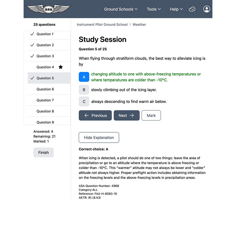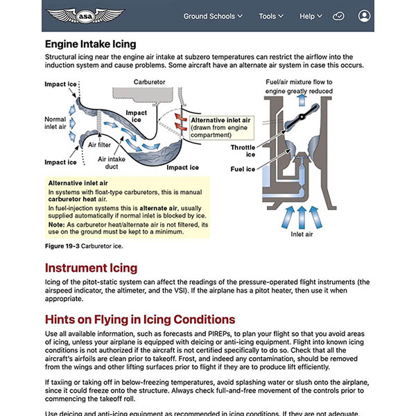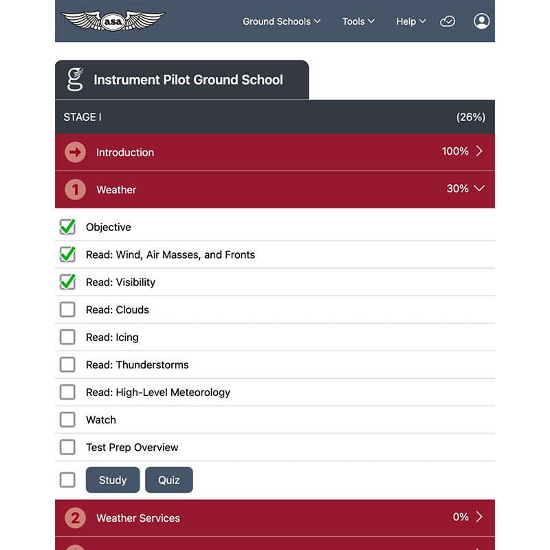 | Online course combines sharp video and the latest instructional aids with the expertise and experience of ASA’s industry-leading eBooks and test preparation materials for a comprehensive, convenient aviation ground school program. Prepare for the FAA Knowledge Exam and the cockpit, online with this on-demand solution from ASA. From the cloud, to you. Anytime. Anywhere. On any internet-connected device. Gain the aeronautical knowledge required to become a safe and competent instrument-rated pilot with this on-demand solution from ASA. With ASA’s time-tested and trusted content, this convenient on-demand solution is effective for self-study and the organization makes it an easy addition to any classroom-style ground school. The comprehensive curriculum consists of lessons featuring internet-based evaluation, resources, and course tracking, supported with professional multi-media presentations from the leaders in aviation training. Read: ASA's Instrument Rating Test Prep (online) and The Pilot's Manual: Instrument Flying (online) Watch: ASA Instrument Pilot Virtual Test Prep…Nearly 10 hours of video presentations Study and Prepare: Study FAA questions with answers, explanations, and review modes from Prepware and take practice tests to obtain your FAA Knowledge Exam endorsement Course Contents: Introduction, Weather, Weather Services, Flight Instruments, Navigation, Regulations & Procedures, Departure, En Route, Arrival & Approach, and Test Tips. Also included: on-screen CX-3® Flight Computer, fully-searchable FAR/AIM and Instrument Rating Airman Certification Standards (FAA-S-ACS-8).. Complete the Instrument Pilot Online Ground School on all your internet-connected devices for the ultimate in flexibility. Log in from your desktop, laptop, smart phone, iPad or other tablet computer;the course knows where you left off regardless of which device you last used. Upon completion of the course and practice tests you'll receive your Endorsement letter and Graduation Certificate. Review all lesson components even after completion of the course to also serve as a refresher, with access available for 24 months (after course registration date). |