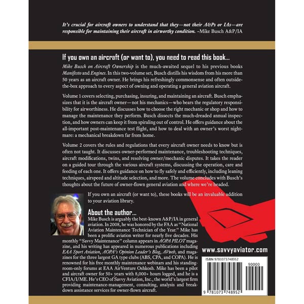 Mike Busch on Airplane Ownership is the much-awaited sequel to his previous books Manifesto and Engines. In this two-volume set, Busch distills his wisdom from his more than 50 years as an aircraft owner. He brings his refreshingly commonsense and often outside-the-box approach to every aspect of owning and operating a general aviation aircraft.