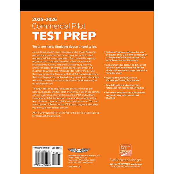 Tests are hard. Studying doesn’t need to be. Join millions of pilots and mechanics who chose ASA and passed their tests the first time, using the most trusted resource in FAA test preparation. Test material is expertly organized into chapters based on subject matter and includes introductory text and illustrations, questions, answer choices, answers, explanations (for correct and incorrect answers), and references for further study. Use the book to become familiar with the FAA Knowledge Exam, then use Prepware for unlimited study sessions and practice tests, and receive your test authorization (endorsement) at no additional cost! The ASA Test Prep and Prepware software include the figures, legends, and full-color charts you’ll see at the testing center. Questions cover all Commercial Pilot and Military Competency FAA Knowledge Exams and are identified by test: airplane, rotorcraft, glider, and lighter-than-air. You can also count on ASA to monitor FAA test changes and update you through a free email service. ASA’s Commercial Pilot Test Prep is the pilot’s best resource for successful test-taking.