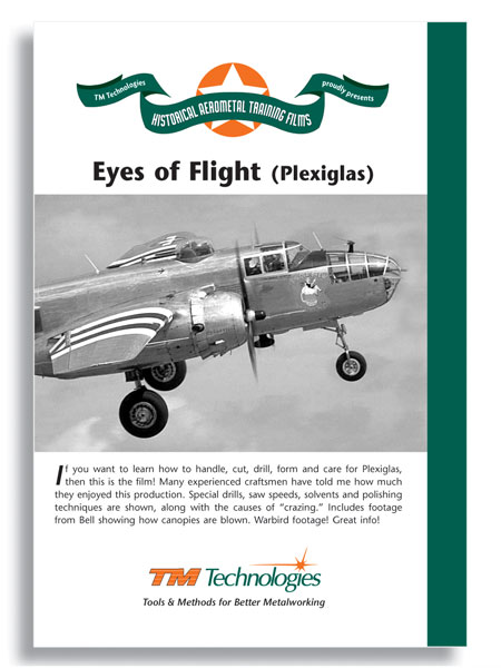 If you want to learn how to handle, cut, drill, form and care for Plexiglas, then this is the film! Many experienced craftsmen have told me how much they enjoyed this film. Special drills, saw speeds, solvents and polishing techniques are shown, along with the causes of "crazing". Includes footage from Bell showing how canopies are blown. Warbird footage! Great info! |