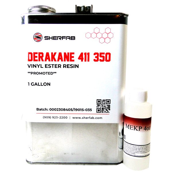 **Note: 3 month shelf life** Derakane Momentum 411-350 epoxy vinyl ester resin is based on bisphenol-A epoxy resin and provides resistance to a wide range of acids, alkalis, bleaches, and organic compounds for use in many chemical processing industry applications. Derakane Momentum resins are a new generation of resins that can be used to improve fabrication efficiency and product quality. Their lighter color makes defects easier to see and correct while the resin is still workable. The resin's improved reactivity properties often permit and increase in the lay-up thickness per session. The longer stability provides additional flexibility to fabricators in storage and handling. Resin: Color may vary by manufacturer. Warning: MEKP Catalyst is very dangerous to the eyes. Always wear full goggle protection and have running water at hand when working with MEKP. |