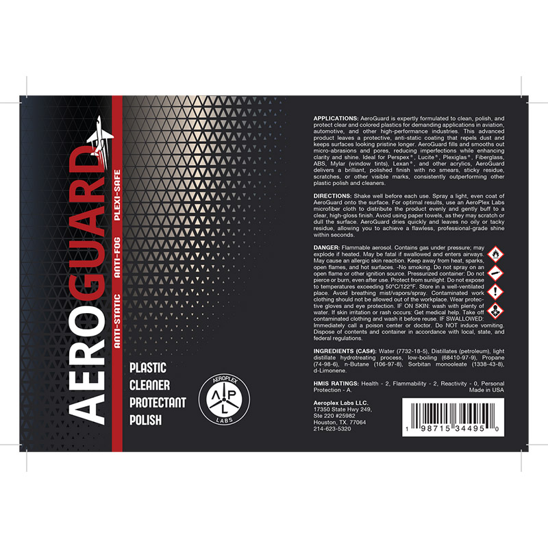 AeroGuard is the ultimate solution to clean, polish, and protect clear and colored plastics and acrylics, expertly designed for demanding applications in aviation, automotive, and other high-performance industries. This advanced formula not only restores surfaces to a pristine, polished finish but also leaves a protective, anti-static coating that repels dust, resists fog, and provides water-repellant protection, keeping surfaces clearer for longer. Engineered to fill and smooth micro-abrasions and pores, AeroGuard reduces imperfections while enhancing clarity and shine. Its safe, alcohol-free formula outperforms competitors by avoiding harmful chemicals like ethanol, alcohol, or ammonia, making it gentle yet highly effective for even the most sensitive materials. Ideal for aircraft windows and instrumentation, automotive components, industrial safety glasses, outdoor gear, and more, AeroGuard sets a new standard in plastic and acrylic care. Choose AeroGuard for professional-grade results you can trust, every time. |