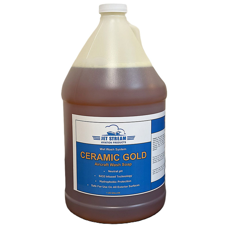 | Ceramic Gold Aircraft Wash Soap is a neutral pH product that will deliver a hydrophobicfinish and a brilliant high gloss shine. Utilizing the latest technology of silica infused polymers, Ceramic Gold will safely lift and remove dirt from surfaces. Can be used over existing waxes, sealants, or protective coatings to improve durability, gloss, and beading. The active SiO2 molecules within the formula chemically bond to the clean surface, providing durable defense against the elements. |