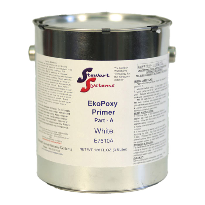 | EkoPoxy Primer (includes catalyst) is a two-part catalyzed primer. While it is slightly more expensive than EkoPrime, it offers some key advantages. Like EkoPrime, EkoPoxy has excellent sandability. It also has powerful corrosion inhibiting properties and is an excellent option for coating bare steel or properly etched aluminum. EkoPoxy is very durable and is unaffected by solvents and fuels. If left exposed it will be more durable than EkoPrime. There are some disadvantages of EkoPoxy in comparison to EkoPrime. First, when priming small parts as you build, it will create more waste as it is a catalyzed product and once it is mixed it has a pot life of 4-5 hours after which it cannot be used. Second, EkoPoxy is not as flexible as EkoFill and EkoPrime and must not be used on fabric. The two main applications where EkoPoxy is recommended are protection from corrosive environments or areas that will be subjected to fuel or oil and are not top coated. It is recommended that one use EkoPoxy on the exterior of metal or composite aircraft for maximum durability. EkoPoxy is available in four colors: white, smoke grey, charcoal, and zinc chromate green (tinted to simulate ZC primer – it does not contain zinc chromate). |