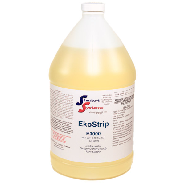 | Stewart Systems EkoStrip is a non-hazardous, water-soluble paint stripper. EkoStrip is very effective at removing some of the toughest coatings in the industry. It will easily remove polyurethane and acrylic coatings that other paint removal products find difficult. EkoStrip will not harm any metal substrates. It does not dissolve the coatings but releases the bond to the substrate, and the coatings come off in sheets. EkoStrip can be applied with a brush, roller or sprayer. Its gel consistency adheres to vertical surfaces well. Once applied, EkoStrip can be covered with light-weight plastic to prevent evaporation if more time is required for stubborn coatings. Ambient temperature has a very significant effect on EkoStrip. Higher ambient temperatures will increase the effectiveness exponentially with 90°F being optimal. Once EkoStrip has reacted with the coatings, removal with a hot power washer is ideal. EkoStrip is environmentally friendly and can be washed down the drain, but the coatings should be captured and disposed of in solid waste. EkoStrip should never be used on fiberglass or composite substrates and may damage some types of plastic. EkoStrip tends to not be very effective on some types of primers such as zinc chromate. A typical GA aircraft will require a 5-gallon pail of EkoStrip to fully remove the paint. |
