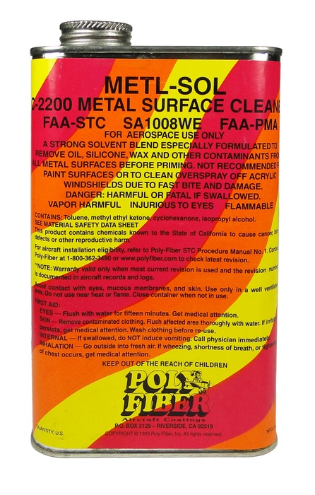 A strong solvent blend formulated to remove oil, silicone, wax and other contaminants from all metal surfaces before priming. Not for painted surfaces. Available in quart and gallon sized. This FAA approved process utilizing Poly-Fiber Dacron fabrics and the unique "Poly" line of finishes assures a beautiful, durable, weather-resistant cover job every time. Documented time tested results by the professionals. The Poly-Fiber Covering Process was issued Supplemental Type Certificate No. SA-1008-WE in 1965 and this number will apply to all aircraft. Note: Formerly known as Stits covering process. Only Poly-Fiber materials may be used through the topcoat paint to comply with STC requirements. Poly-Fiber finishes are required for approval. Poly-Fiber is approved for use on most certified aircraft. To be sure, check the approved model list in the procedure manual. CAUTION: Flammable. Important Notice: All mixed paints are special order and are non-returnable. |