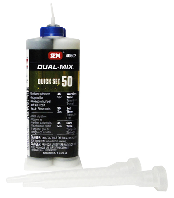 | Black, fast curing urethane adhesive designed for automotive plastic repair. With a 50 second work time, an excellent choice for quickly repairing bumper brackets, tabs, headlight buckets and grills. It may also be used for bonding backer panels, moldings emblems and most small plastic, metal and aluminum parts. |