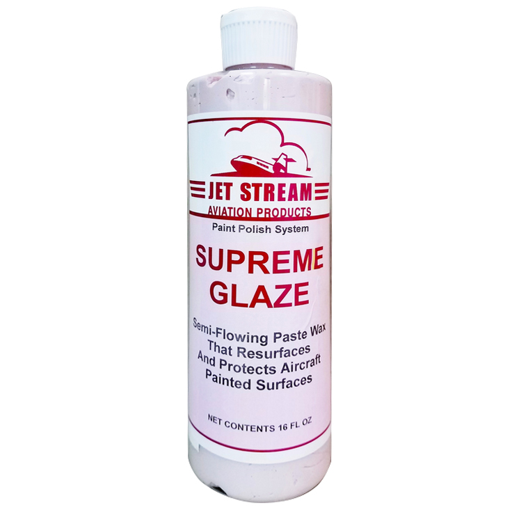 | Supreme Glaze is a semi-flowing paste cleaner wax that cleans, shines, resurfaces, all aircraft painted surfaces while bringing out the brilliance of the original color. Supreme Glaze safely removes light to medium oxidation and scratches. Excellent for use on carbon exhaust stains associated with aircrafts such as King Airs. Supreme Glaze contains color brighteners and will protect against oxidation, salts, UV rays, hydraulic fluid, insect residue and acid rain. Can be used by hand or machine polisher. |