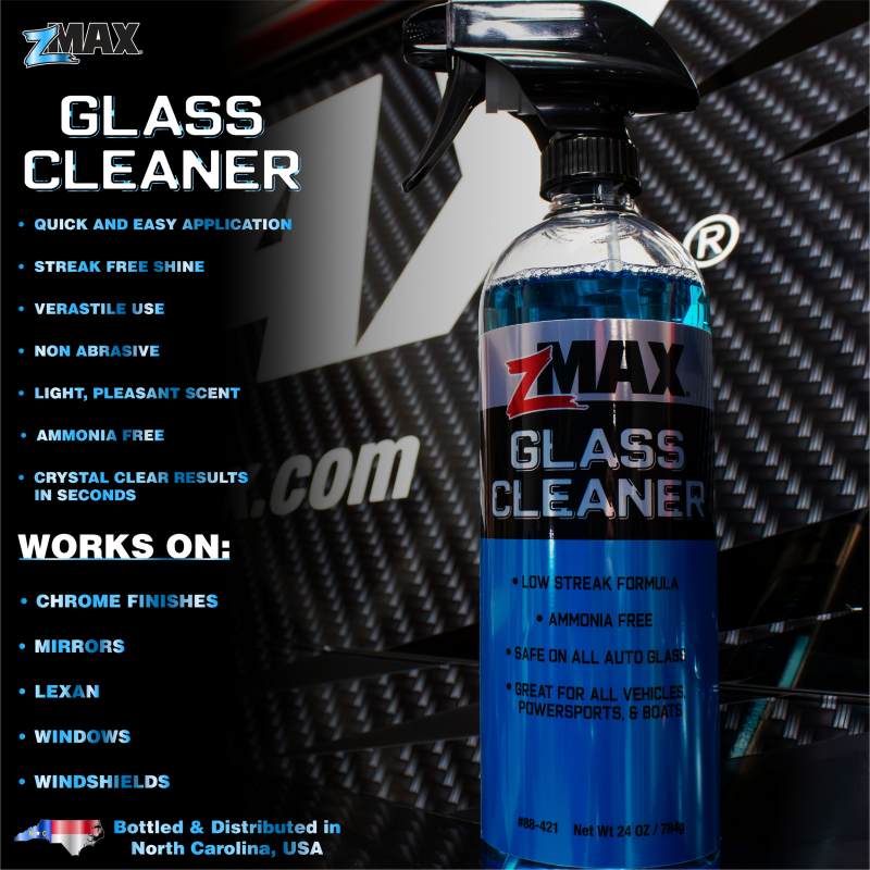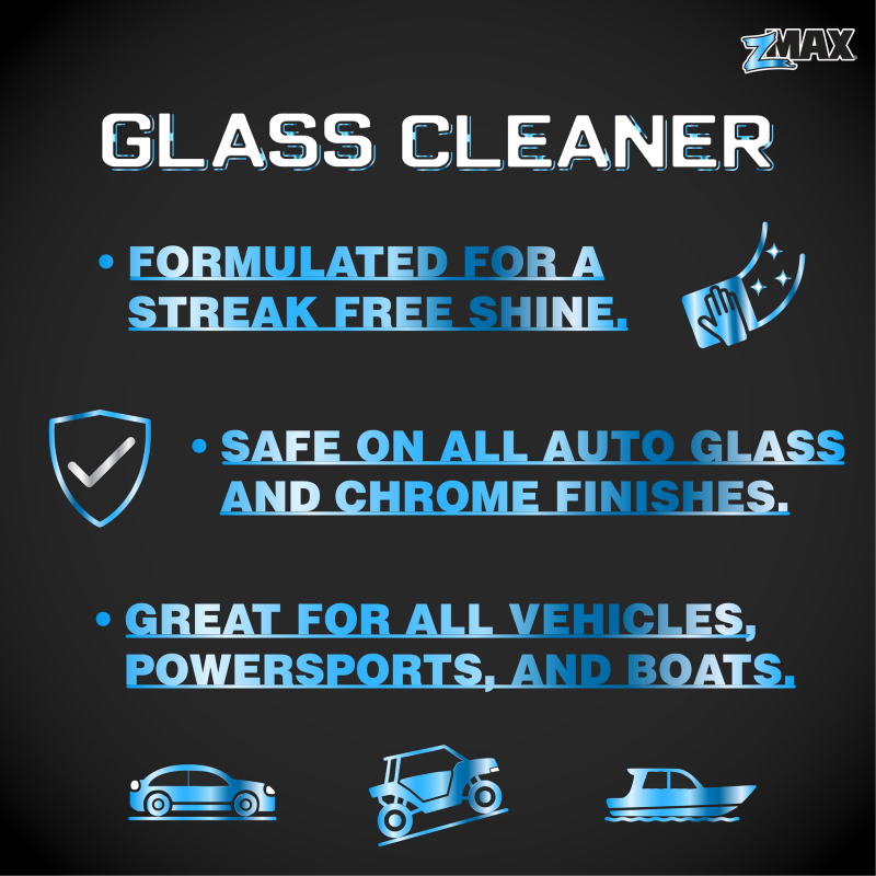 | 24oz. zMAX Glass Cleaner is specially formulated for a streak free shine in seconds. A quick spray and wipe gets rid of dust, fingerprints, and smudge with ease. Safe on all windows, mirrors, and chrome finishes. Great for Vehicles, powersports, boats, planes, and home. |