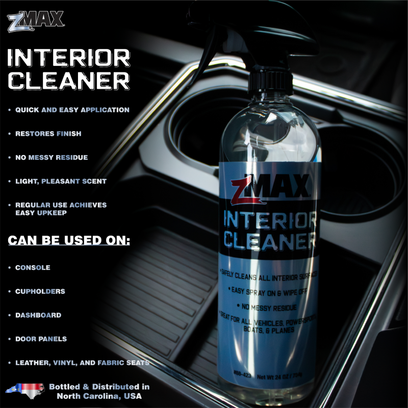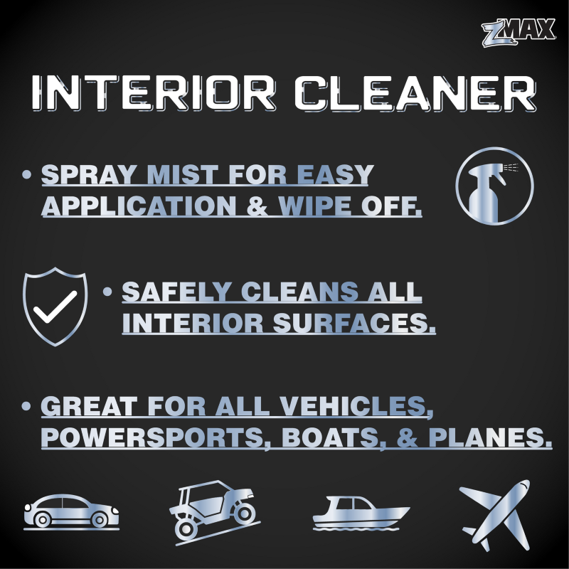 | 24oz. zMAX Interior Cleaner is specially formulated to clean and refresh all interior surfaces. Its light, pleasant scent complements a strong formula to effortlessly lift dust and everyday grime leaving a showroom finish with no greasy residue. Great for all vehicles, powersports, boats, and planes. |