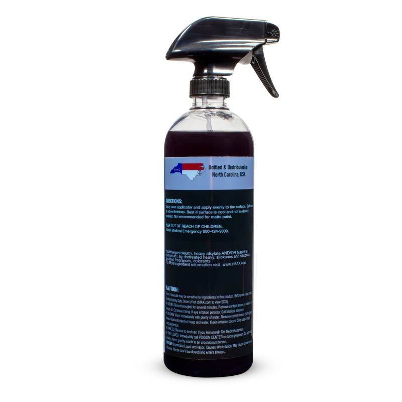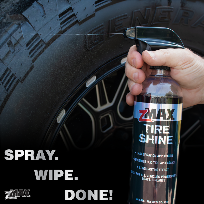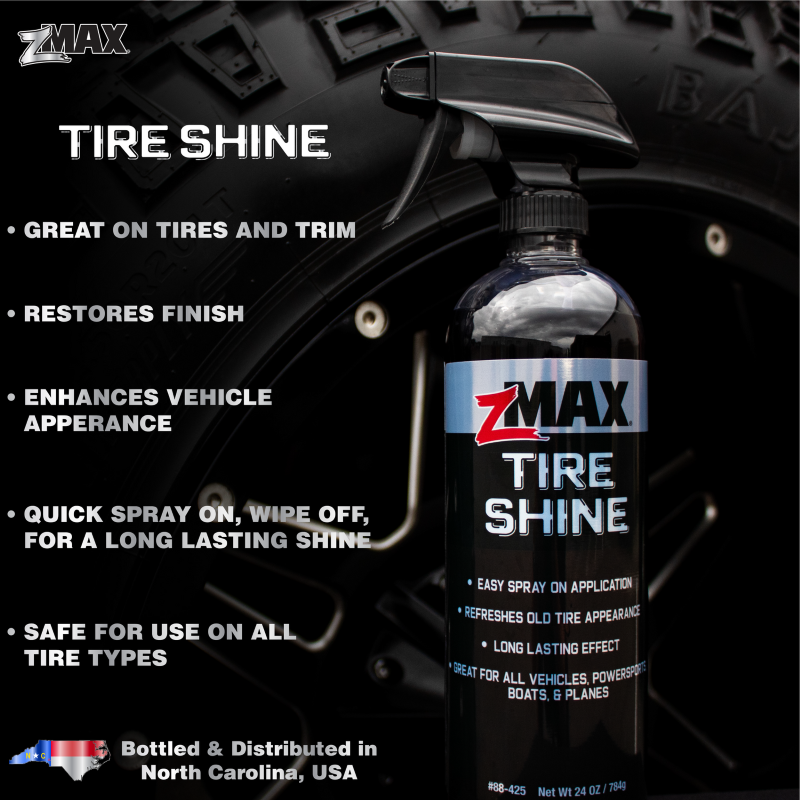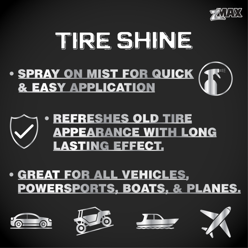 | 24oz. zMAX Tire Shine is specially formulated to restore and enhance old tire appearance with a deep black gloss. Achieve a long-lasting showroom shine in seconds with a quick spray on and wipe off. Great for all vehicles, powersports, and planes. |