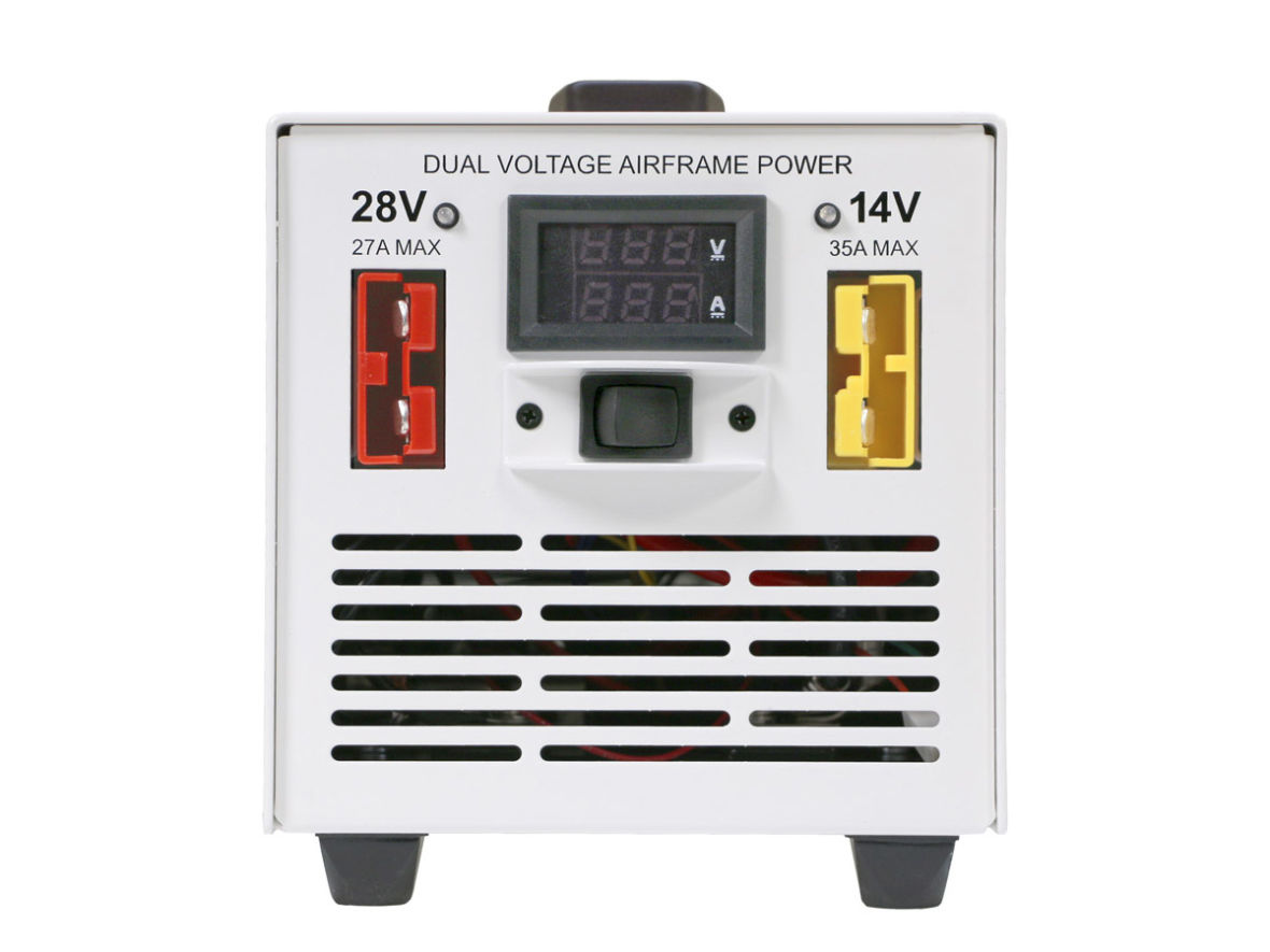 The M1428-DV Mini-GPU is a specialized switching-mode power supply designed to provide pilots and aviation maintenance professionals with a portable, affordable source of stable, high-current, noise-free DC power that replicates the in-flight electrical environment. It contains discrete outputs for either 14 or 28-volts DC, selectable by a front panel switch. It only provides one output voltage at a time, switch-selected and indicated by the front panel voltmeter display. The GPU’s intended purpose is to energize an aircraft’s main electrical bus without using the ship’s battery or engine. It will safely provide continuous power for the most delicate electronics and airframe systems up to its full rated output.