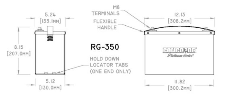 RG-350 is housed in an aluminum container that includes two perforated vent areas machined into each side with riveted aluminum cover. Lifting straps across cover. Fixed with foot styled hold downs integrated at both ends of the battery. Male threaded post terminals.