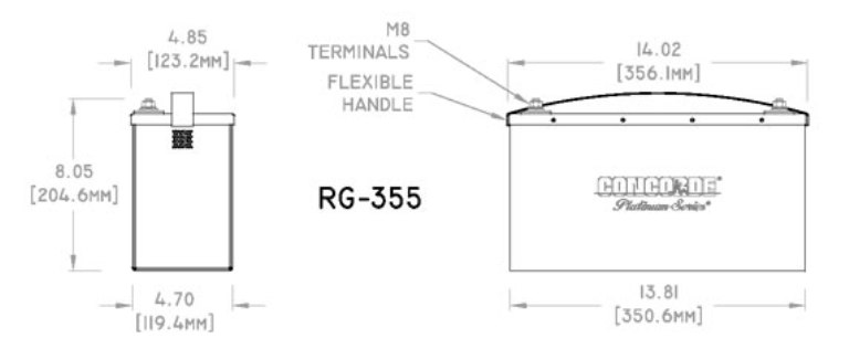 The RG-355 is a Concorde Platinum Series Aircraft Battery. The Platinum Series is comprised of premium hand made AGM Aircraft Batteries with excess power for many applications. Recombinant Gas - The RGŪ Series are low resistance, valve regulated lead acid (VRLA) batteries. RG-355 is housed in an aluminum container that includes two perforated vent areas machined into each side with riveted aluminum cover. Lifting straps across cover. Fixed with foot styled hold downs integrated at both ends of the battery. Male threaded post terminals. |