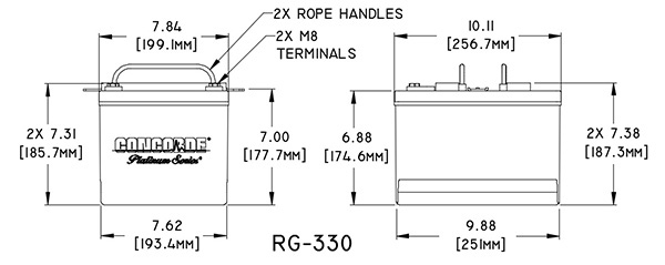 RG-325 is housed in a polypropylene container with lifting rope attached to the molded polypropylene cover. M8 silicon bronze alloy terminals for corrosion free connections and maximum conductivity.