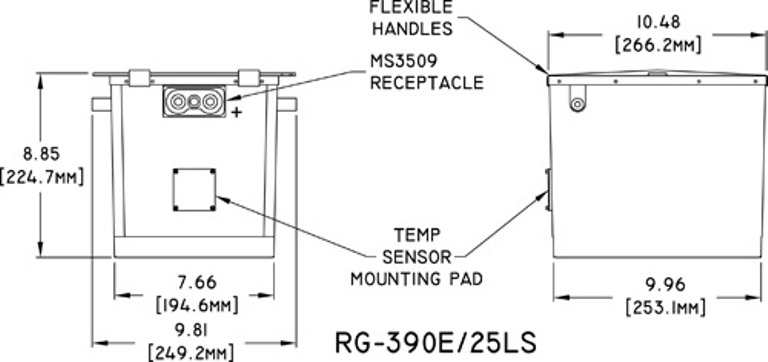 RG-390E/25LS is a fireproof, stainless steel battery equipped with a temp sensor mounting pad, side vent tubes of polypropylene and fabric lifting straps.