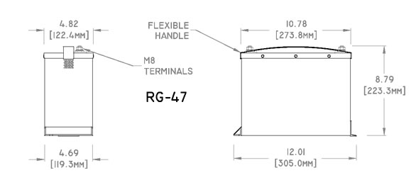 RG-47 is is fire resistant powder coated aluminum container with perforated vent areas machined into each side of the container. Two metal foot brackets are welded to the bottom of each side of the container. Aluminum powder coated cover is riveted to the container and the terminals at the top are male threaded posts. |