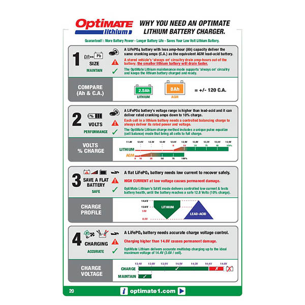 | The Optimate TM-281 is designed for 24-28V Lithium batteries. This will charge and maintain your lithium battery with 5 amps of energy. This lithium charger also has a “tune” or power source mode of delivering 4 continuous amps of energy so you can program your EFIS or retune your car plus a pushbutton activated BMS “wake up” mode to safely wake up a battery out of sleep mode. This Optimate Lithium charger will quickly charge your 24V battery, maintain it at the optimal voltage so it is ready to go when you are, but also has a feature of being a power source of 5 continuous amps! For example, you can use it as power supply while programming your aircraft EFIS or supply power to your car while retuning it. |