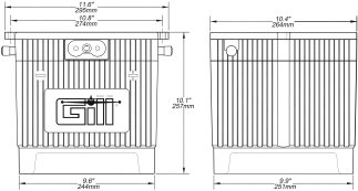 Top of battery 10.45" Length x 12.20" Width | Bottom of battery 9.862" Length x 9.582" Width | Full Height of battery 10.35"
