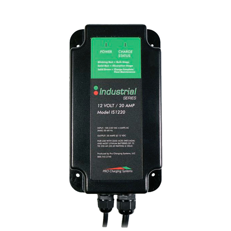 | The Pro Charging Systems Industrial Series (IS) is a powerful, high-frequency charger.  Output is 12 Volt, 20 Amp.  It delivers superior performance in a smaller and lighter form factor with exceptional power and value. The IS series utilizes a state-of-the-art firmware engineered to make the batteries perform better and last longer! The charger ships with SB50 Red connectors. Led lights indicate battery state of charge. Approved for use on Flooded, AMG and most lithium batteries. The charger is fully automatic and after completing charge cycle, the charger goes into a maintenance mode to ensure equipment is ready when you are! Reverse polarity protection, Waterproof (IP67), DOE / CEC compliant, FCC 15 Parts A and B Interference Compliant, DC charge cable = 5ft, AC power cord = 3ft, Two Year Warranty! |