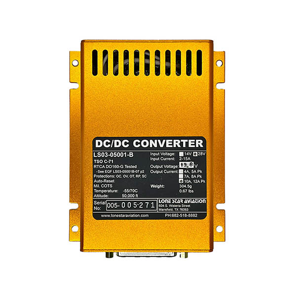 | Lone Star Aviation’s FAA TSO approved DC-DC down converter is the first choice among OEMs and dealers for a high reliability power supply. This third generation converter was designed to operate as a STEP UP or STEP DOWN power supply. The main converter output is for 28VDC to 13.8VDC to a maximum of 10/12P Amps which operates 13.8 vdc equipment in a 28 volt aircraft. Additional outputs for the STEP DOWN are 5, 7.5, 9, 13.8, 16, 19, 24, 28 vdc. The STEP UP is an option and special order for 14 volts to 5, 7.5, 9, 13.8, 16, 19, 24, 28 vdc. Designed with our latest dc power module operates at 96% efficiency, multiple output voltages and OV, OC, OT, SC, RP protections. LS03-05001-B was tested under RTCA DO160G environmental testing. The connector kit – LS03-05026-1, is required and sold separately.