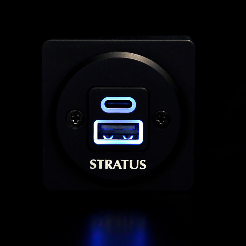 The Stratus Power Pro features dual 3.0 amp USB-A and USB-C connectors for interface with both legacy and new portable electronics. The charging ports are backlit for easy view in low-light conditions. Stratus Power Prof provides 20% more power than the original Stratus Power, providing sufficient fuel to fully recharge smartphones and tables even while they are in use.