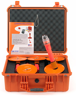 LANDING STRIP LIGHT KIT An "airfield in a suitcase" solution. A fast-deployed, 10 light kit of our Landing Strip Light. Used for expeditionary, improvised or temporary airfields. Suitable for a 1,000' runway, if placed at typical 200' intervals (max.). Order multiple kits for longer runways. Operators Liability- The system has been designed to be operated under normal visual meteorological conditions for night flying by a pilot with normal vision. The system is utilized at the operator's discretion and risk. The suppliers accept no liability whatsoever whether implied or explicit for any incidents/accidents that may incur. The operator must ensure that trained personnel operate the system and are made fully aware of aviation safety and that the runway remains clear of animals, pedestrians and obstructions at all times during landings and takeoffs. Only competent and currently night rated pilots may use this system. Use by student pilots training for night rating is prohibited. Landing Strip Light Kit Jr. 10 light basic kit, packed in a Pelican 1550 equipment case for ease of storage, handling, and set up. Suitable for a 1,000' runway. Weight: 50lb. Note: Kit uses 3 "C" batteries. 3 batteries will provide approx. 30 hrs of continuous use. |