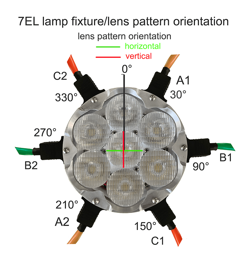 For the A, B, C variation choices, the taxi light "-7EL" has a rectangular shaped beam of 34+ degrees Horizontal and 11+ degrees vertical, with this in mind there are 6 total possible positions for the power connector and still maintain the beam width in a lateral (horizontally optimal) position for most taxiing purposes. A purchaser only needs to select A, B, or C options for the "7EL" The A version provided both A1 or A2 positioning (180 degrees apart) A1 and A2 opposing orientations still provides the identical proper optics orientation. Each choice A, B, C provides 2 power connector positions. the same is true for B and C choices, B 1/2 and C 1/2. Just choose for the optimal power input connector shown positioning for your installation. If an error is made when ordering, we can quickly swap for the corrected position. There may be some specialized circumstances (Tail Dragger etc.) where the customer might desire a different than standard / normal taxiing light positioning, this is easily accomplished the same way with the above choices.