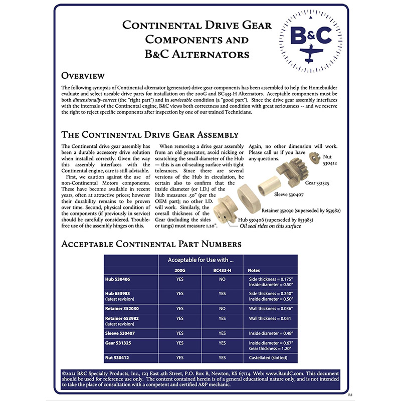 The BC433-H is sold less the Continental drive gear assembly (which is usually customer supplied), and requires the latest revision of the Hub (P/N 653983) and Retainer (P/N 653982). B&C sells NEW gear assembly parts (Genuine Continental Motors) – please call for current pricing. Gear assembly parts can also be located at most air salvage dealers such as Preferred Airparts LLC, Air Salvage of Dallas, Texas Air Salvage, Dodson International Parts, and others. For Experimental Aircraft ONLY |