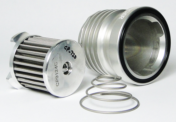 The filter element is made from medical grade, type 304 stainless steel micronic filter cloth providing unmatched protection against oil contamination and resultant engine damage. A rare earth magnet is installed in the top of the element for magnetic pre-filtering of the oil. The unique twist lock design allows for easy disassembly, inspection and cleaning. The quad-ring gasket doubles the seal between the filter and the engine . The filter housing is carved out of a solid piece of 6061 T6 billet aluminum with cooling fins, which not only looks good but aids in dissipating heat. |