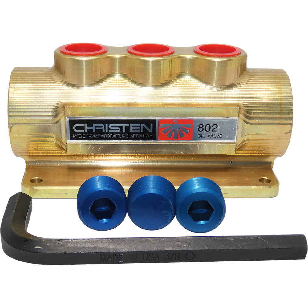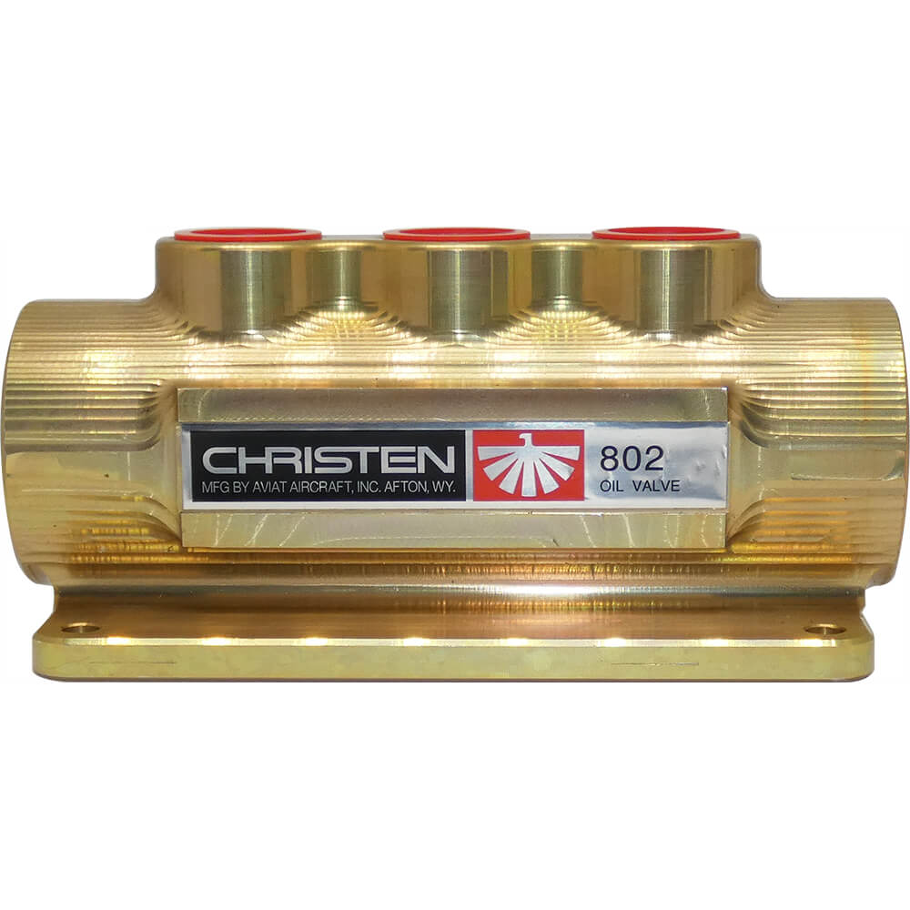 Christen 802 oil valve is a multiple port gravity operated ball valve. Cast aluminum w/textured white epoxy enamel finish & all internal steel parts are cadmium plated. Normally installed on firewall or engine mount. Designed for fittings to be installed at side, front or both. Req. 3 AN816-10D nipples for hose connection. Wt.1.75 lbs. installed.