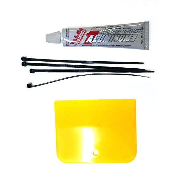 Complete kit includes RTV and plastic spreader. 3M adhesive is amazing. Works as advertised. Its so nice to check the oil and feel how warm the dipstick is.