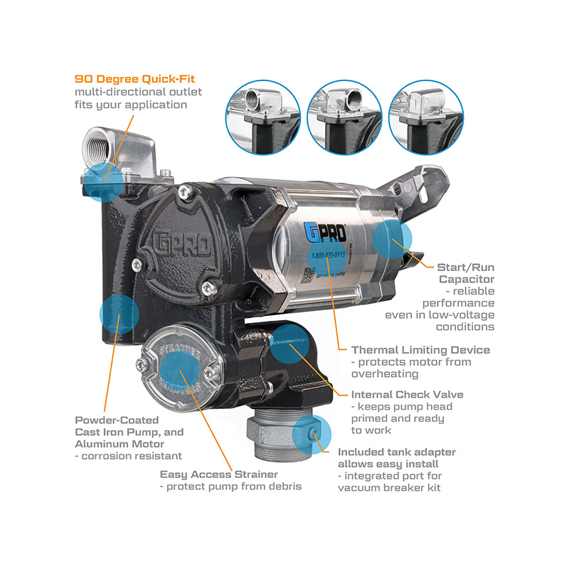 | The GPRO V20-115 series is the next-generation modular vane pump for stationary applications fueling large equipment. The V20 is engineered to deliver consistent high-pressure performance from a tough, hard-working modular vane pump. 115V AC motor delivers up to 20 GPM (76 L/min). It’s fast and flexible; able to load up to 600 gallons of fuel. Includes a quick-fit modular system (4 bolts and an O-ring) that allows easy, leak-free attachment of filter, meter, or both. Extreme Temperature (XT) models available. Whether your business is agriculture, construction, or managing vehicle fleets, staying fueled up is critical, and it must be a quick and dependable process. |